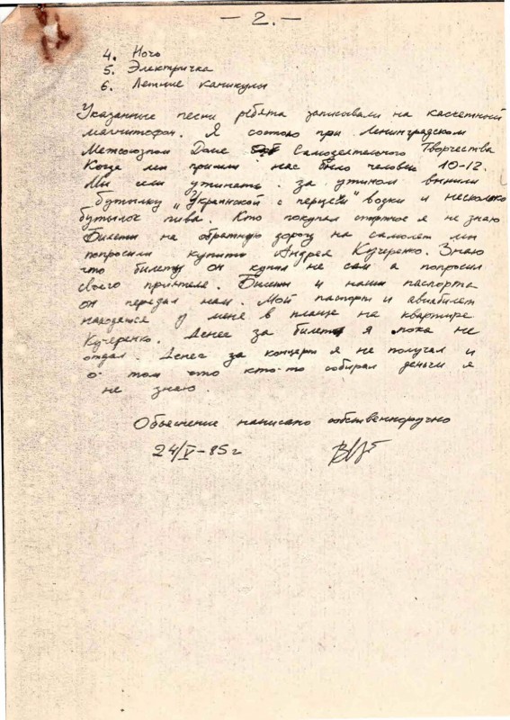 Указанные песни ребята записывали на кассетный магнитофон. Я состою при Ленинградском Международном Доме Самодеятельного Творчества. Когда мы пришли нас было человек 10-12. Мы сели ужинать, за ужином выпили бутылку "Украинской с перцем" водки и несколько бутылок пива. Кто покупал спиртное я не знаю. Билеты на обратную дорогу на самолет мы попросили купить Андрея Кучеренко. Знаю что билет он купил не сам, а попросил своего приятеля. Билеты и наши паспорта он передал нам. Мой паспорт и авиабилет находятся у меня в плаще на квартире Кучеренко. Денег за билет я пока не отдал. Денег за концерт я не получал и о том, что кто-то собирал деньги я не знаю. Объяснение написано собственноручно. 24/V - 85".