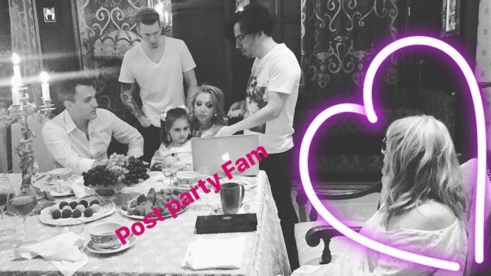 В доме певицы собрались композитор Игорь Николаев с женой певицей Юлией Проскуряковой, актриса Олеся Судзиловская, дизайнер Валентин Юдашкин с женой Мариной, дочь Кристина Орбакайте с мужем Михаилом Земцовым и детьми Дени Байсаровым, Никитой Пресняковым и Клавдией Земцовой.