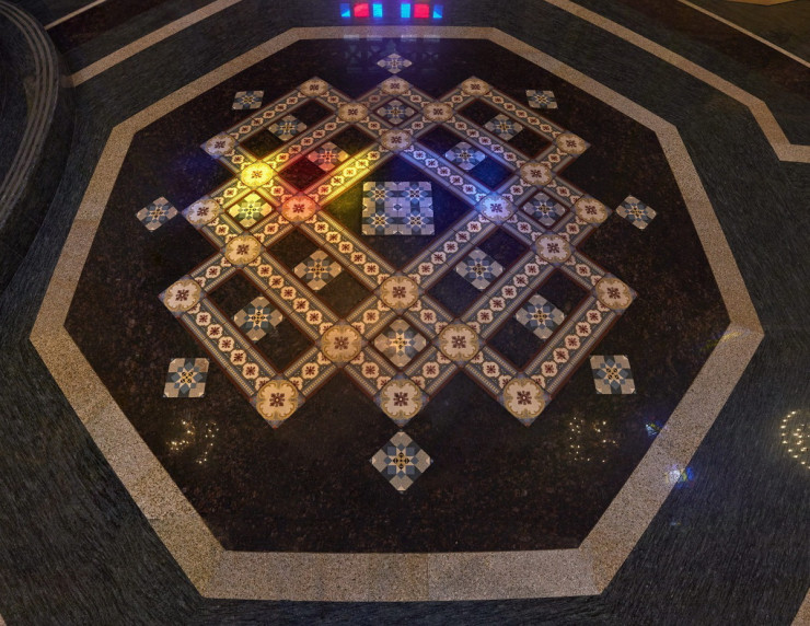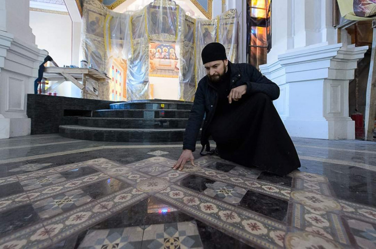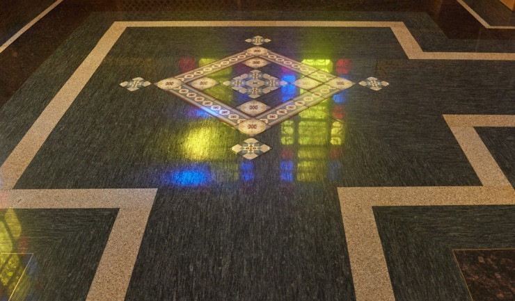 "Мы связывались с немецкой фабрикой, - рассказывает священник. - Оказалось, что плитку такого размера они уже не выпускают. Чтобы выполнить наш заказ, заводу пришлось бы смонтировать новую производственную линию. За наш счет, конечно. Выходило очень дорого. Поэтому мы решили сделать пол тоже по самым передовым технологиям уже нашего времени - наборным, из различных пород полированного гранита, добываемого в Индии, Бразилии, Китае. А из извлеченной исторической плитки выложили несколько розеток - художественных панно, которые украсили пол собора. Они очень хорошо сочетаются с новым решением".