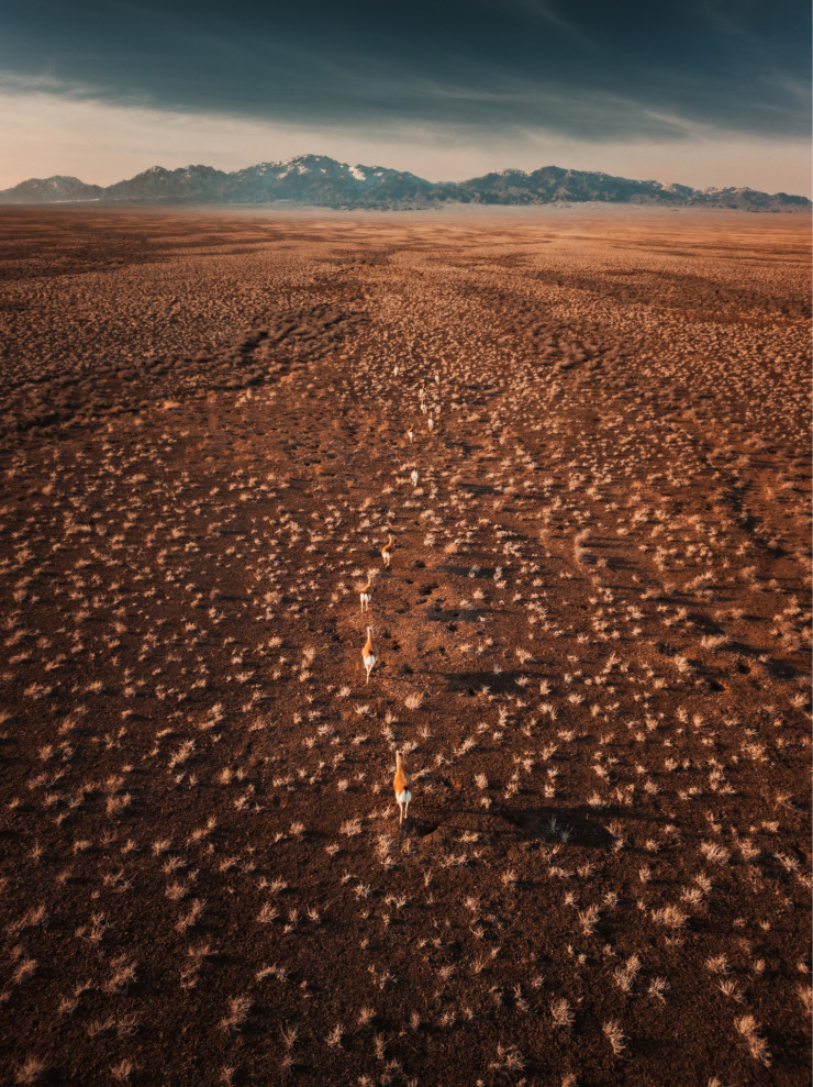 "Мне повезло. Вдалеке увидел маленькую стаю джейранов, решил заснять их на дрон, одна стая маленькая привела меня к еще большей, они слились и получились кадры с огромной стаей. Это огромная редкость, нечасто можно их застать", - делится Александр Кузнецов.