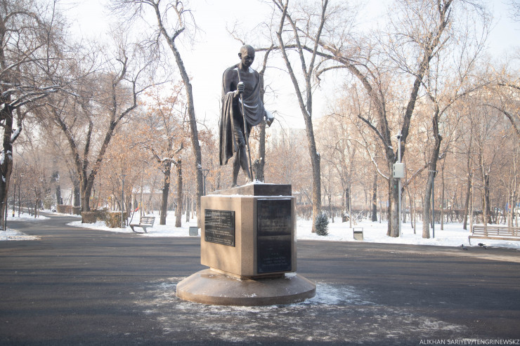 Осталась последняя и самая крупная точка нашего маршрута. Это сквер за кинотеатром "Сары-Арка" на пересечении проспектов Абая и Алтынсарина, который является последним пристанищем для памятников Владимиру Ленину, Михаилу Фрунзе, Максиму Горькому, Михаилу Калинину, борцам Октябрьской революции, Павлу Виноградову и Дмитрию Фурманову. Они все когда-то возвышались на алматинских улицах.
