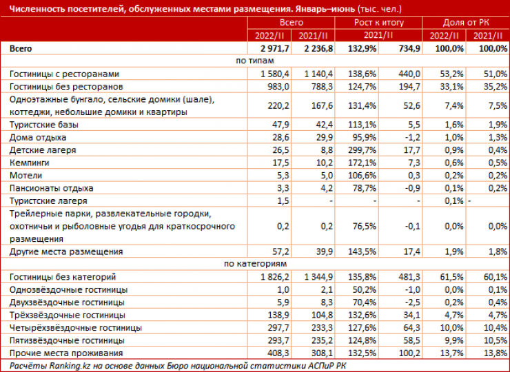 За шесть месяцев 2022 года места размещения обслужили почти 3 миллиона гостей — на 32,9 процента больше, чем годом ранее.