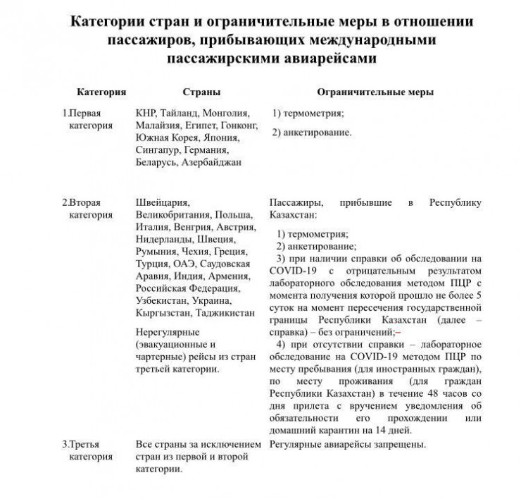 "Иностранные граждане должны будут иметь справку об отрицательном результате на COVID-19 со сроком не более трех дней в момент пересечения госграницы, в противном случае не будут приняты на борт воздушного судна из аэропорта вылета.