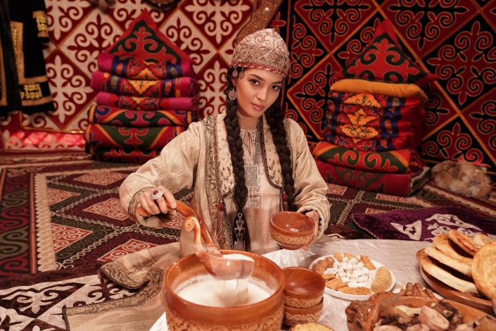 Наконец мы приехали на самые "аппетитные" съемки. Рассказ пойдет о казахской национальной кухне. "Мисс Казахстан" Мадина Батык заходит в юрту, где накрыт богатый дастархан с шубатом, казы и бешбармаком.