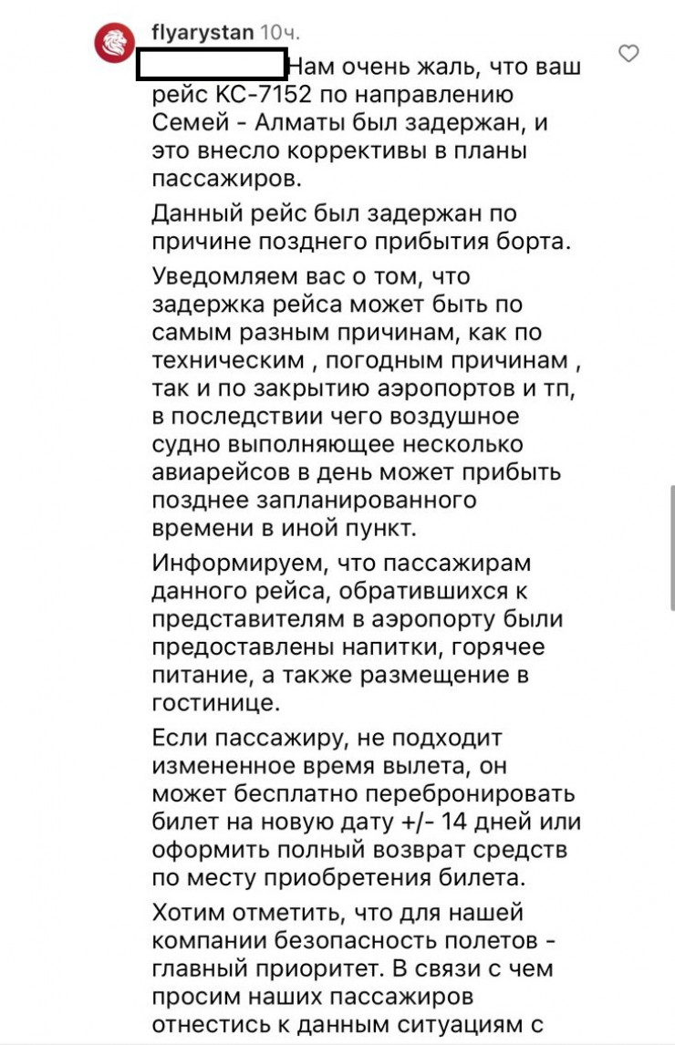 "Ваш рейс KC-7152 по направлению Семей - Алматы был задержан, и это внесло коррективы в планы пассажиров. Данный рейс был задержан по причине позднего прибытия борта.