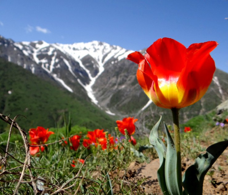 В конце весны можно увидеть, как цветет иридодиктиум, уникальный ирис-подснежник, тюльпан Грейга, который стал эмблемой заповедника, и нежные тюльпаны Колпаковского и Кауфмана.