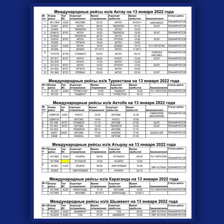 Информация по Алматы готовится. Итого по РК планируется выполнение 63 рейсов и отменен один рейс.