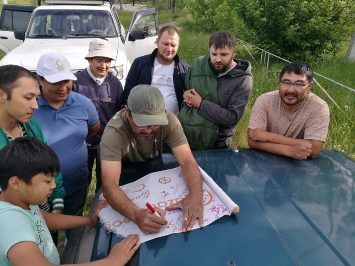 Традиционный обряд завершения экспедиции - роспись на флаге QazaqGeography. Фото ©Владимир Прокопенко
