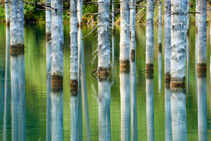 На самом деле эти ели уже погибшие, а то, что они сохранились в таком виде, является результатом своеобразной "консервации" по причине низкой температуры воды. Максимальная температура воды достигает +6 градусов.