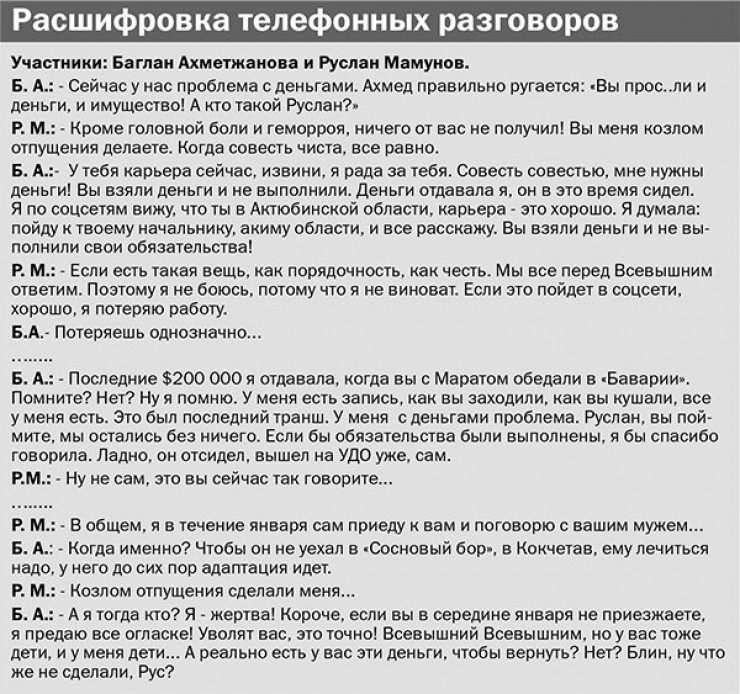 "В 2016 году бывшего акима Костаная приговорили к 13 годам лишения свободы за взятки в особо крупном размере. Уже через несколько месяцев брат и жена бывшего градоначальника предприняли попытки для смягчения приговора, передав нескольких крупных взяток Мамунову. На тот момент Руслан был бизнесменом и не имел отношения к госслужбе, но жил в столице, что не исключало наличия нужных связей. По словам родственников Ахметжанова, вместо обещанной помощи Мамунов "ничего абсолютно не решил". У Руслана Мамунова, который был задержан антикоррупционщиками в феврале 2019 года, когда он уже работал заместителем акима Актюбинской области, две версии о выполнении своих обязательств", - отмечает издание.