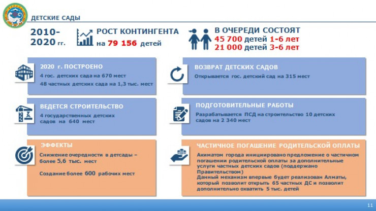 В прошлом году построено 4 государственных детских сада на 670 мест и 48 частных дошкольных организаций на 1,3 тысячи мест. Кроме того, ведется строительство 4 государственных детских садов на 640 мест. Также после возврата из долгосрочной аренды и проведения сейсмоусиления с капремонтом открывается детский сад на 315 мест.