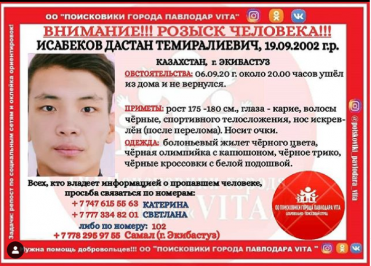 С заявлениями в полицию обратились родители подростков. Ориентировки на пропавших Жанель Кузембаеву и Дастана Исабекова волонтеры разместили в Instagram.