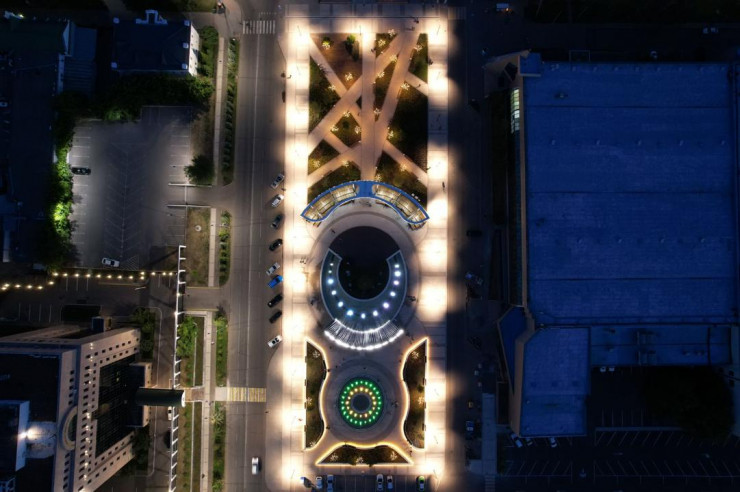 На площади установили фонтаны в форме чаши с туманным испарением, дугообразный фонтан, в скором времени заработает сухой фонтан в форме шара.