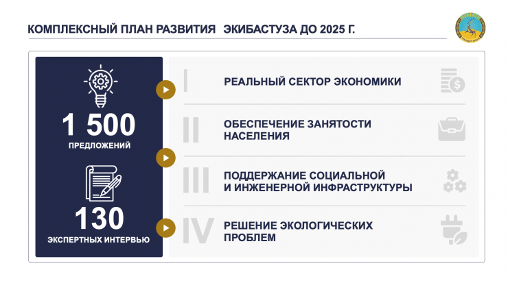 "Сотрудничество власти, науки и бизнеса – один из важных аспектов развития Экибастуза. Во взаимодействии с вузами планируется готовить специалистов для новых профессий. До 2025 года ожидается создание 16,5 тысячи рабочих мест. Ежегодно профессиональную переподготовку и обучение основам бизнеса будут проходить 400 человек. В 2025 году число субъектов МСБ вырастет до 10 тысяч, а выпуск их продукции – в 1,4 раза", - сообщил аким Павлодарской области о втором направлении КПР.