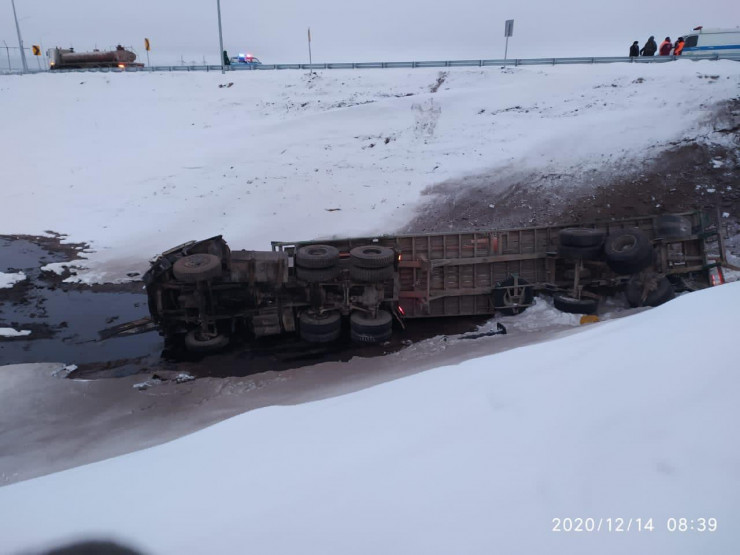 Авария произошла 14 декабря в 11 километрах от Караганды в Бухар-Жырауском районе. Предположительно, водитель большегруза не справился с управлением из-за гололеда и угодил в кювет, после чего машина опрокинулась. В результате ДТП вдоль трассы образовалась лужа из серной кислоты.