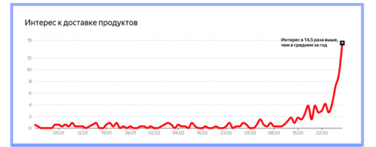 С введением карантина повысился интерес к доставке продуктов. График показывает, во сколько раз интерес к доставке продуктов в данный день был выше обычного.