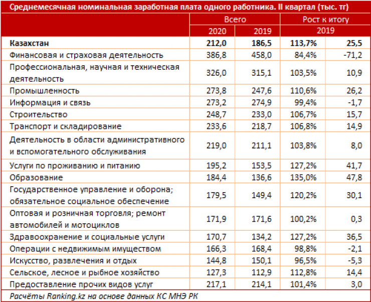 Несмотря на то что наиболее высокие показатели номинальной заработной платы традиционно наблюдаются в сфере финансовой и страховой деятельности (сразу 386,8 тысячи тенге), за год в секторе отмечено сокращение на 15,6 процента, а с учетом инфляции реальное падение покупательной способности составило сразу 21 процент за год.