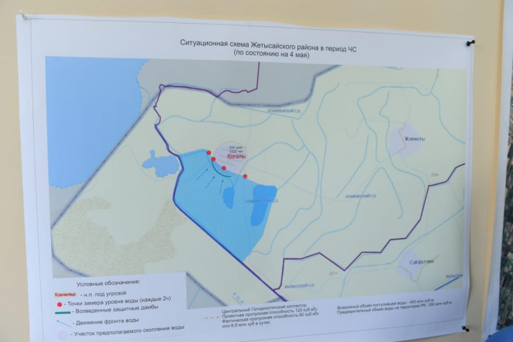 В Жетысайском районе вдоль автомобильной дороги села Когалы ведутся укрепительные работы путем возведения защитной дамбы протяженностью 500 метров (для оборудования дамбы использовано 6000 мешков). К работам привлечено 649 человек, 15 единиц техники. В том числе местными акиматами предоставлено 13 единиц техники, 15 человек, задействовано 30 представителей департамента по ЧС, 4 работника департамента полиции, 2 единицы техники и более 600 добровольцев.