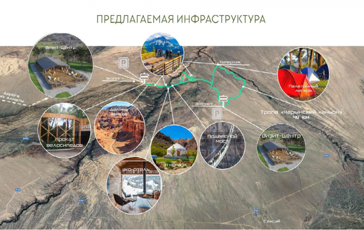 По его словам, в Чарынском нацпарке хотят развить экотуризм за счет привлечения частных инвестиций. А именно: будут размещены два современных визит-центра, обустроят четыре пеших туристических маршрута, создадут этноаулы, установят три смотровые площадки, глэмпинги, кемпинги, караванинги, пункты общественного питания и пункты реализации сувенирной продукции. Для снижения нагрузки на каньон все объекты будут расположены только за пределами каньонов в верхней равнинной части.