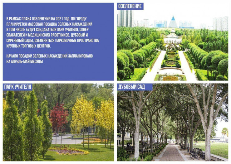"В текущем году продолжим масштабные работы по благоустройству территорий и созданию новых точек притяжения для времяпровождения наших горожан и гостей столицы. К примеру, городские парки планируем закольцевать в зеленую артерию - будут велосипедные и пешеходные дорожки.