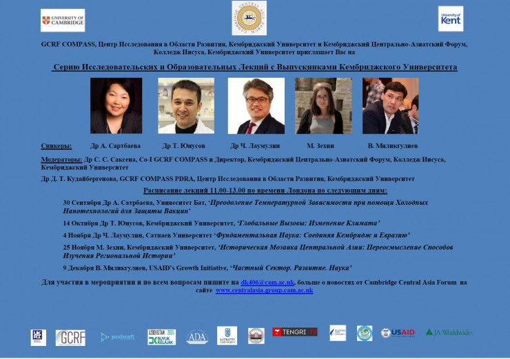 GCRF COMPASS Cambridge представляет интерактивные сессии для вовлечения местных сообществ от ведущих специалистов и исследователей Кембриджского университета, которые также являются выходцами из Центрально-Азиатского региона. Лекторами этих сессий специально выбраны представители Казахстана, Кыргызстана, Узбекистана, Таджикистана и Туркменистана, которые являются выпускниками Кембриджского университета и занимают ведущие позиции в инновационных исследованиях в экономике, политике, социальных, физических и биологических науках.