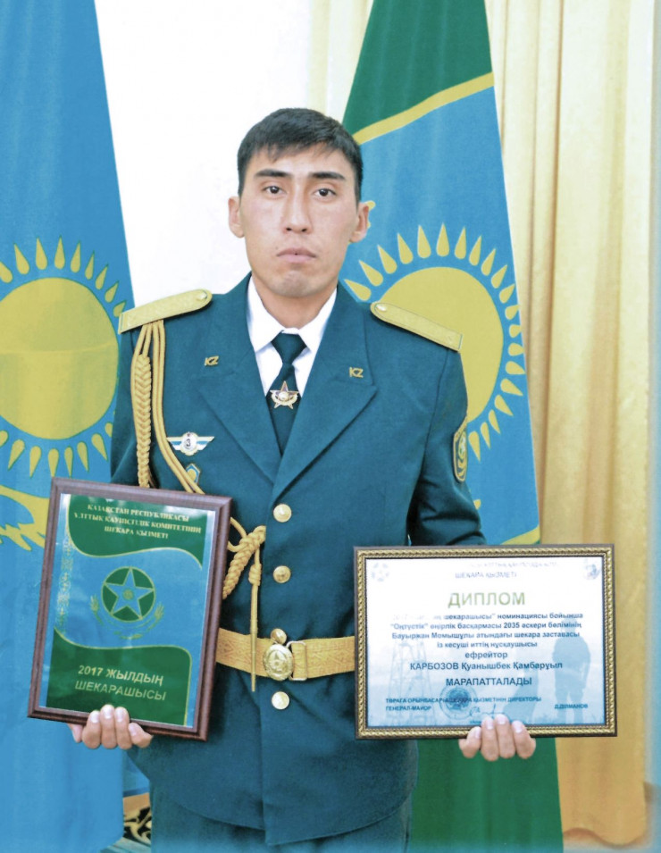 За проявленные мастерство и самоотверженность ефрейтор Куаныш Карбозов решением Военного совета Пограничной службы КНБ признан "Лучшим пограничником 2017 года".