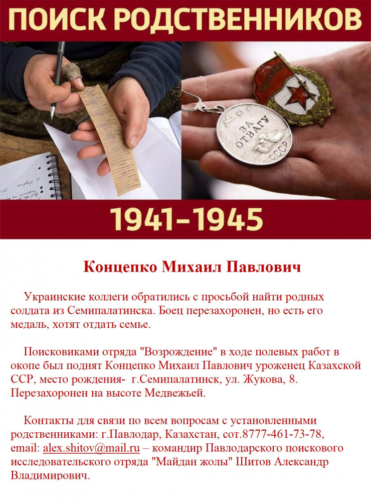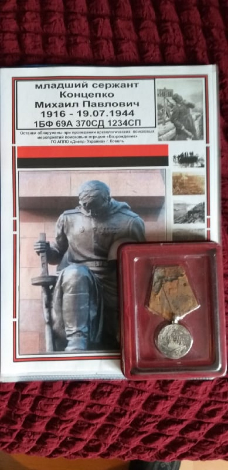 Номер на боевой награде помог установить фамилию фронтовика. Как следует из архивных документов, Михаил Концепко родился в 1916 году в Семипалатинске. Казахстанец призван на службу Ленинским РВК Семипалатинска в августе 1939 года. Младший лейтенант Концепко командовал отделением  противотанковой роты 1234-го стрелкового полка 370-й стрелковой дивизии. Последним местом службы значится штаб 370-й стрелковой дивизии. Был убит 19 июля 1944 года. Первоначально боец  был захоронен в могиле №5 на гражданском кладбище в районе деревни Пшевалы Пужевского района Волынской области.