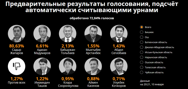 По предварительным данным, на выборах президента Кыргызстана лидирует Садыр Жапаров. Он предварительно набрал 80,63 процента голосов.