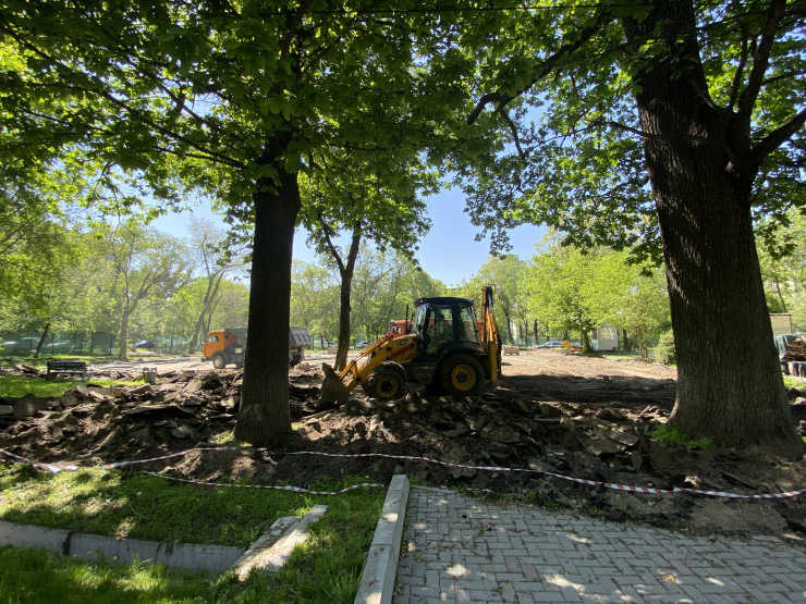 В конце марта парк оградили строительной сеткой. Сейчас там работает тяжелая техника, трактора и рабочие.