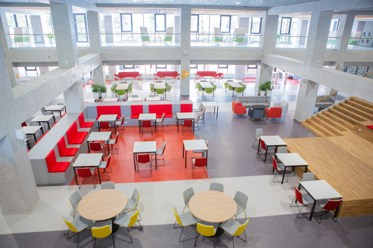 Реконструкцию главного учебного корпуса университета общей площадью 30 тысяч квадратных метров закончили в рекордные 11 месяцев. Его главная особенность – ориентация на устойчивое развитие: при строительстве использовались современные экологичные технологии, материалы и оборудование, на всей территории здания высажены более 30 тысяч зеленых насаждений. Применение передовых зеленых решений в строительстве позволило значительно сократить выбросы вредных веществ на всей территории кампуса, а благодаря внедрению энергосберегающих осветительных приборов экономия энергии ежегодно составит около 120 тысяч киловольт. Всего в новом кампусе насчитывается более 26 IT-лабораторий, 112 аудиторий и 115 рабочих зон в формате open space. Для удобства студентов и преподавателей на территории учебного корпуса круглосуточно и без выходных функционирует современная библиотека, а для иностранных студентов предусмотрен отдельный офис – welcome center.