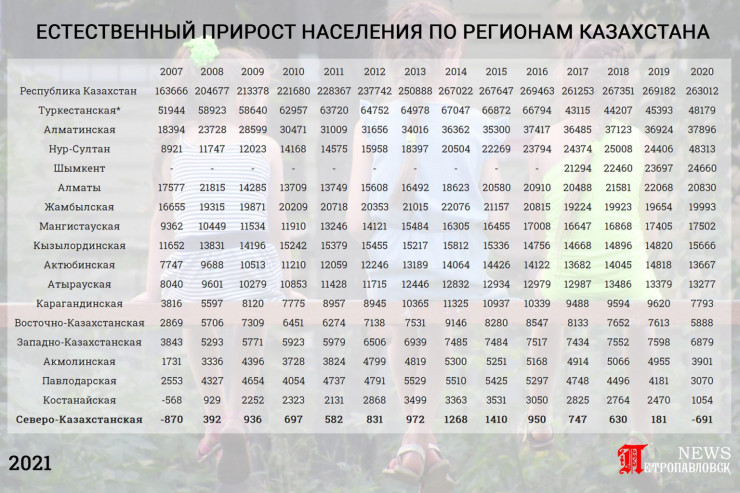 Северо-Казахстанская область - единственный регион страны, в котором 2020 год ознаменовался отрицательным естественным приростом. Это значит, что в СКО за год умерло больше человек, чем родилось.  Все остальные регионы Казахстана, даже те, где наблюдается отрицательная миграция, имеют положительный естественный прирост, передает Tengrinews.kz со ссылкой на Петропавловск.news.