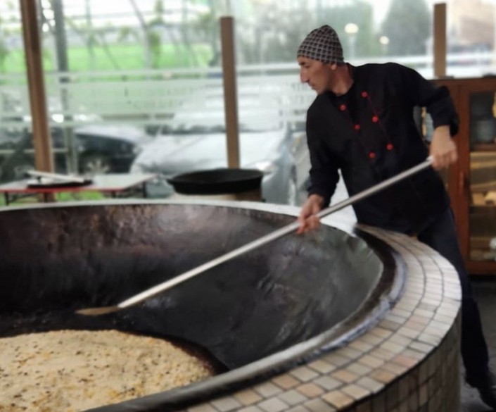 Его начинают готовить с утра во дворе, на дровах и сразу в нескольких огромных чугунных казанах. К 11 часам блюдо готово. Захотите его отведать - приходите до четырех часов, в противном случае к пяти часам застанете только пустые котлы. Также тут подают чай, лимонады и несколько салатов. Алкоголя нет.
