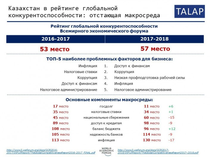Падение в рейтинге последних лет в основном связано с проблемами макроэкономической среды, по показателям которой Казахстан опустился с 69-го до 98-го места(!).