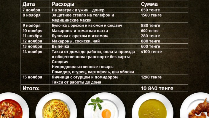 15 ноября я снова проспала и потратила на такси еще 730 тенге. Обедала завтраком - яичницей, колбасой, огурцом и помидором - 560 тенге. Общий итог - 10 840 тенге за восемь дней. А это в среднем по 1355 тенге, что на 508 тенге больше выделенного.