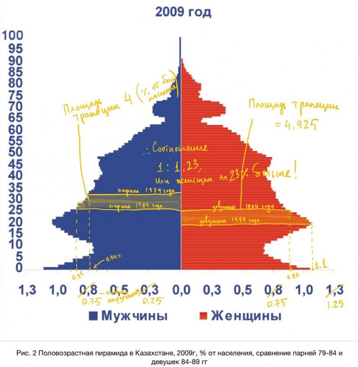 Согласно результатам переписи населения 2009 года, в Казахстане проживало 7,712 миллиона мужчин и 8,297 миллиона женщин, то есть соотношение женщин к мужчинам было больше: 107 к 100, благо уже не 10 к 1, но, возможно, это все же аргумент в пользу тех, кто считает, что женщин в бракосозидательном возрасте больше. Давайте заглянем глубже. Зная, что при рождении 107:100 в пользу мальчиков, очень трудно поверить, что уже в бракосозидательном возрасте статистика перевернется в сторону девушек 107:100. Действительно, средняя продолжительность жизни женщин в Казахстане на десять лет больше: 75 против 65, поэтому можно предположить, что основная разница в соотношении приходится на последние годы жизни. Подумайте сами, как много у нас апашек-вдов.