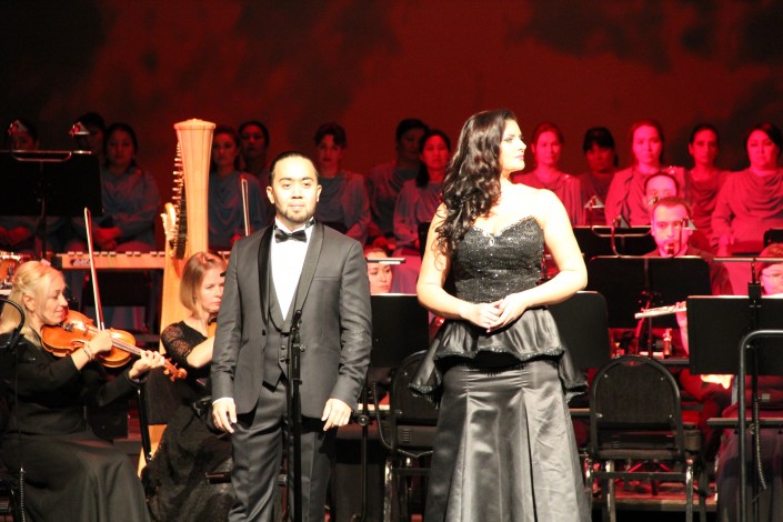 На гала-концерте в Тбилиси прозвучали произведения казахских, западноевропейских и грузинских композиторов в исполнении ведущих солистов театра, заслуженных деятелей РК Гульзат Даурбаевой, Балапан Жубаевой, Дины Дютмагамбетовой, Талгата Кузембаева; лауреатов международных конкурсов Зарины Алтынбаевой, Оксаны Давыденко, Елены Никоновой, Надии Наденовой, Анастасии Кожухаровой, Даны Таласпековой, Дамира Садуахасова, Эмиля Сакавова, Олега Татамирова, Балуана Беркенова, Толегена Рахымбаева, Таира Тажи.