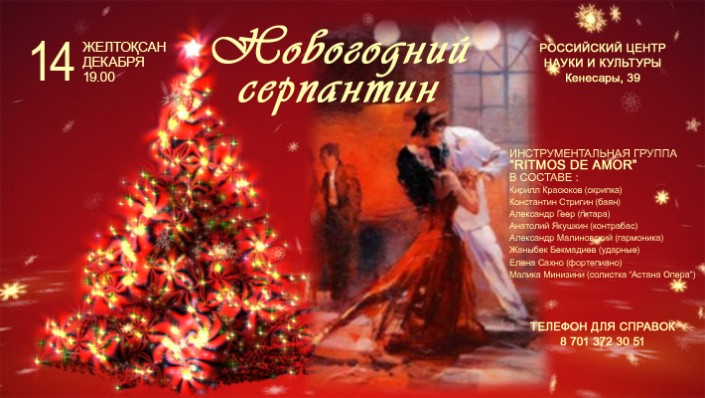 Жителей Астаны ожидает интересное мероприятие. 14 декабря вниманию публики будет представлен концерт "Новогодний серпантин", который пройдет в Российском центре науки и культуры. В концерте принимают участие яркая солистка театра "Астана Опера" Малика Минизини и звездный инструментальный ансамбль Ritmos de amor. Концертмейстером станет Елена Сахно.