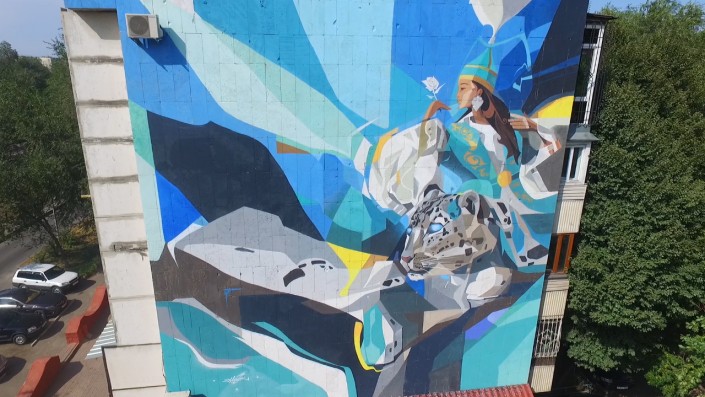 Московский граффити-художник, известный как Zmogk, украсил стену одного из домов портретом казахской девушки и символом города - барса. В своих работах он предпочитает яркие цвета, динамику и некоторый хаос.