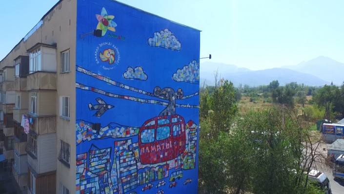 Для рисунков выбирали наиболее смотрибельные и не заросшие деревьями многоэтажки. К примеру, в Турксибском районе на стене шестиэтажного дома появился рисунок семейного очага с национальными орнаментами. Так совпало, что в этом доме живут молодые семьи с детьми. Картину создали украинские художники с помощью красок и баллончиков за две недели.