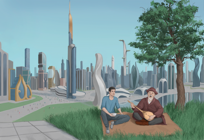 Ерлик Жарылгапов также уделил внимание людям будущего. Судя по его рисунку, в Казахстане будущего по-прежнему любят мотивы домбры и чаепитие.