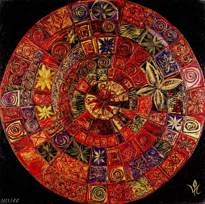 Картины Санжара Жубанова созданы в технике "звездная графика". Этот термин, как и способ исполнения, он открыл для себя после десяти лет опыта ментального рисования. Однажды он понял, что, рисуя точками, он оказывается в медитативном процессе, в тишине которого можно услышать себя.