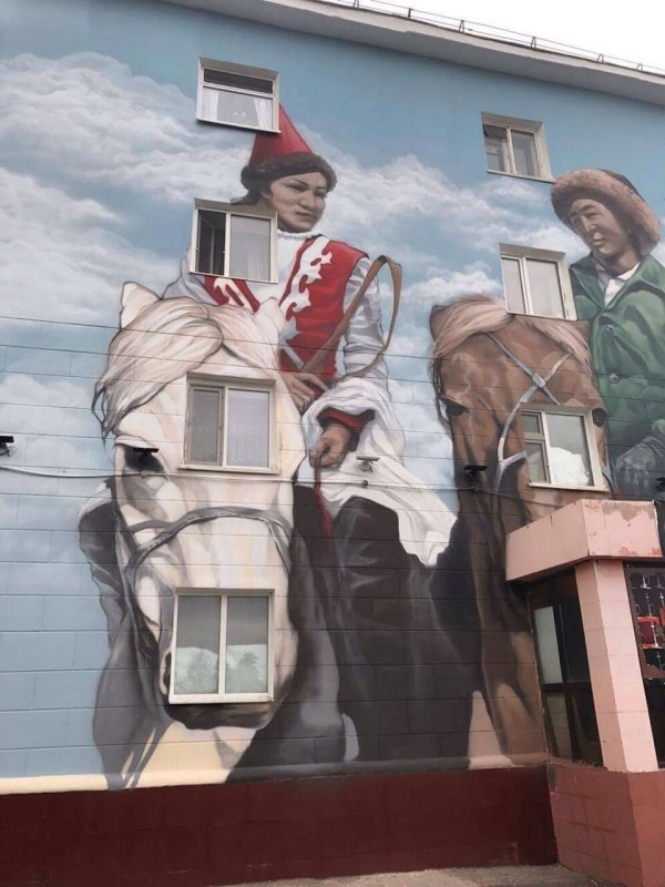 Впервые в Астане на жилом доме появился городской мурал, то есть уличное граффити. Новая картина была нарисована художниками арт-группы DOXA на фасаде четырехэтажного жилого дома по адресу: улица Бейбитшилик, 1. Источником для вдохновения проекта послужила историческая фотография 70-х годов, сделанная для набора открыток из Целинограда. Мурал под названием "Открытка из Астаны" рассказывает о национальных традициях, прошедших через века, и в то же время иллюстрирует недавнее прошлое города, запечатлев его жителей.