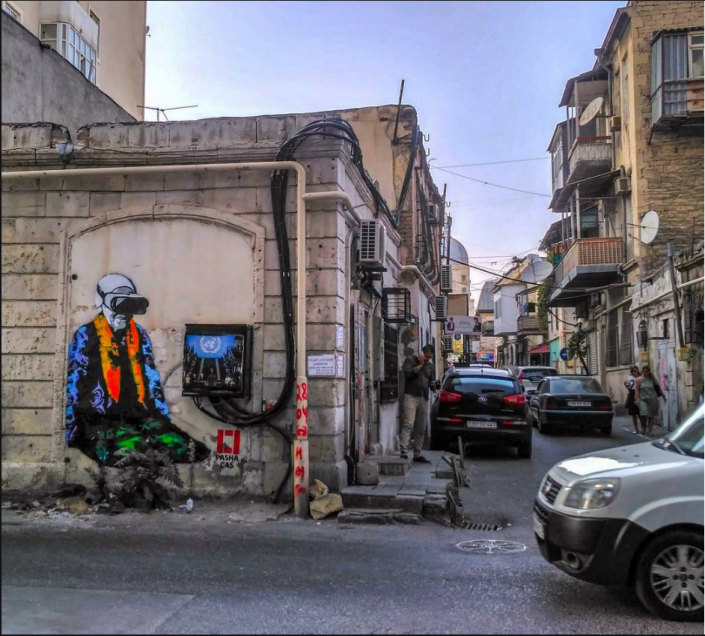 Казахстанский стрит-арт-художник Паша Кас отметился граффити в столице Азербайджана - Баку, передает корреспондент Tengrinews.kz.