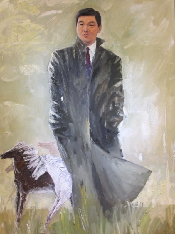 Автор картины рассказал, что картина называется "Моя молодая республика". "Все говорят, что человек на картине похож на Бауыржана Байбека. Конечно, это так, а что тут скрывать. Он не позировал. Я рисовал по фотографии, в Интернете очень много его фотографий", - рассказал художник.