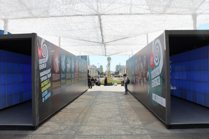 Автор этой кинетической скульптуры "Под вечным небом" Ермек Аркаров изобразил в своем творении солнцеликого человека. "Это образ Тенгри - бога кочевников. Здесь можно увидеть цепочку из природы, животных, которые становятся одной линейной. Художник также пытается передать, что современное искусство за счет кинетики может внедриться в архитектуру города", - рассказала куратор раздела современного искусства Аида Адильбекова.