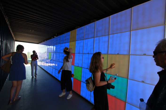 По обе стороны границ фестиваля гости попадают на специальные интерактивные площадки. Внутри установлены десятки мониторов, которые меняют цвет в такт движения человека. Вкупе с атмосферной музыкой, которая звучит внутри, площадка становится отличным местом для коллективных танцев.