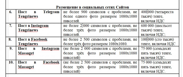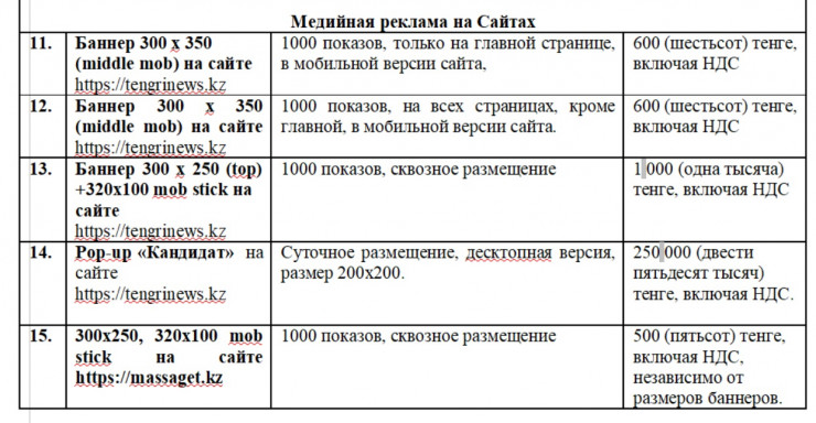 Стоимость размещения агитационных материалов на Сайтах «https://tengrinews.kz/» и «https://massaget.kz/» составляет: