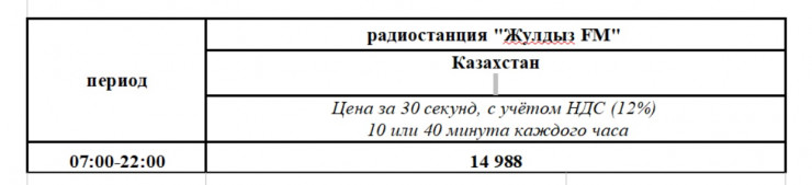 Предоставление эфирного времени на Радио осуществляется путем размещения аудиороликов, хронометражем не более 60 (шестидесяти) секунд на государственном и русском языках.