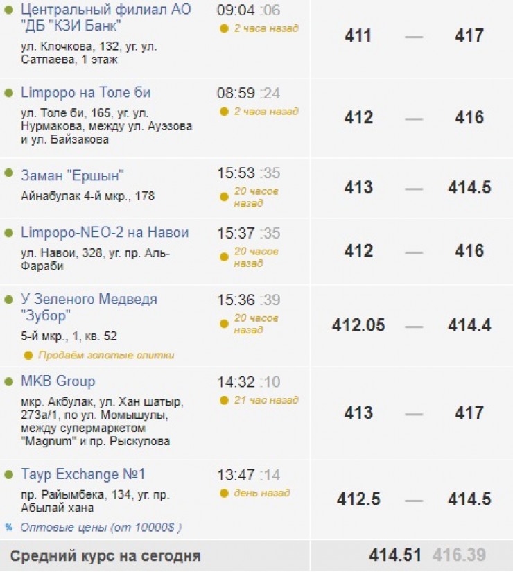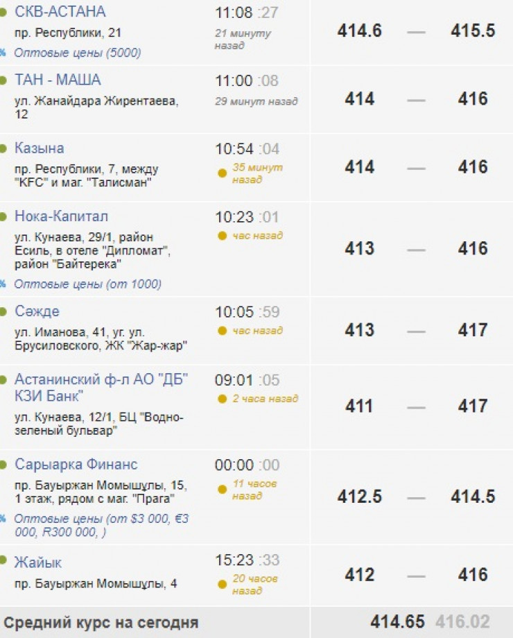 В Алматы его к этому часу продают по 414,4-418 тенге. Средний курс продажи составляет 416,39 тенге.