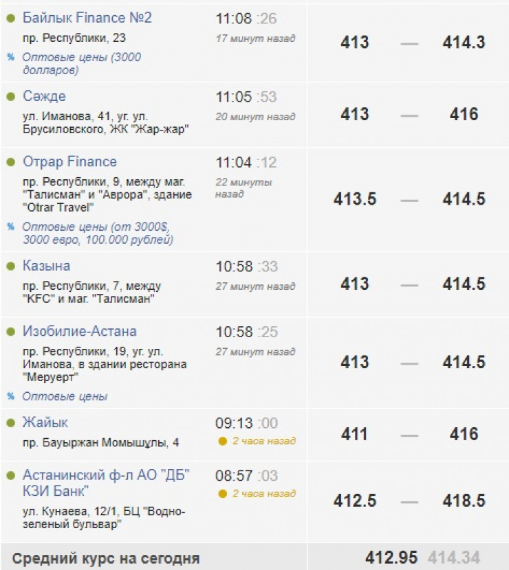 Отметим, что накануне средний курс доллара в обменных пунктах Нур-Султана составлял 416,2 тенге, а в Алматы - 416,84 тенге.